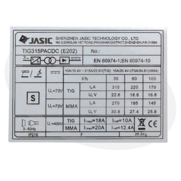 | Komplektacija | Jasic TIG315P AC/DC E202 suvirinimo šaltinis, 5m WP-18 TIG suvirinimo rankena, 3m 500A įžeminimo kabelis su gnybtu, Atsarginės dalys |